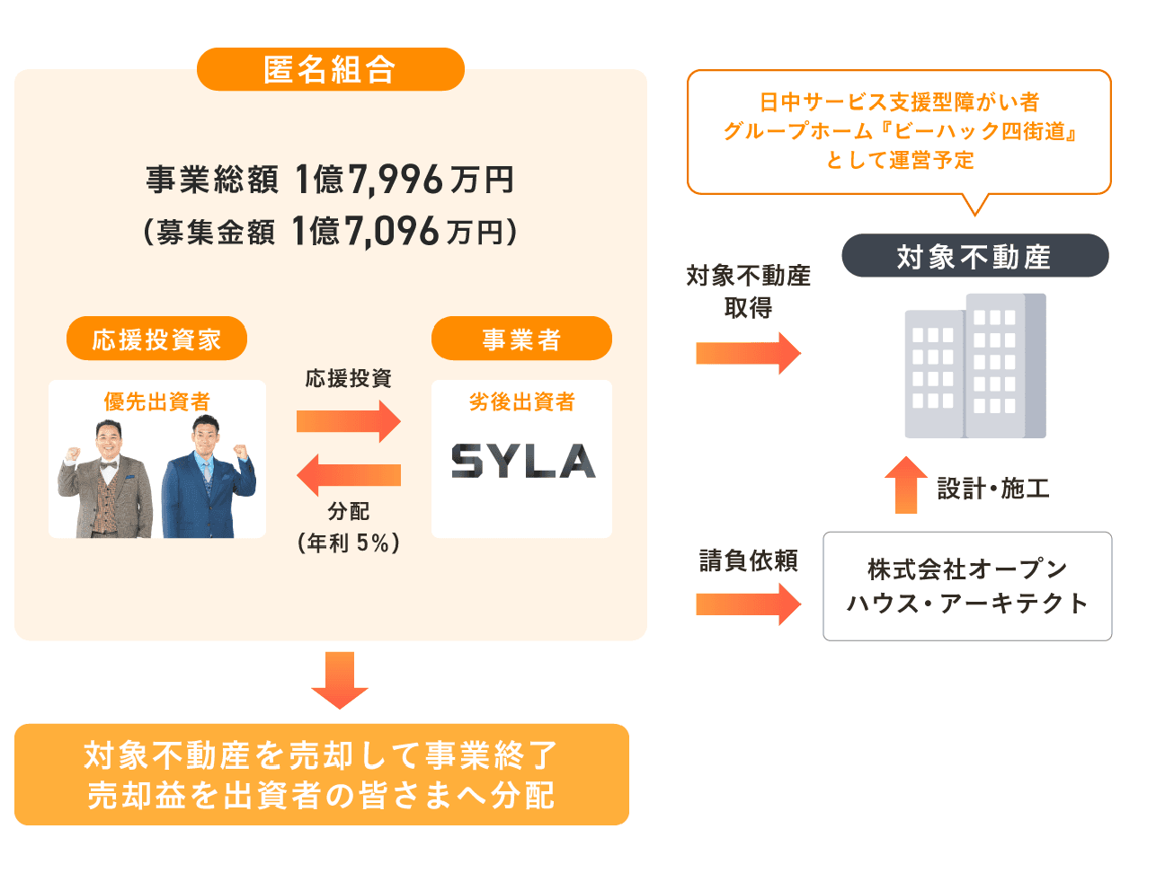 The mission of SYLA Co., Ltd. (Head office: Shibuya-ku, Tokyo; CEO: Yoshiyuki Yuto; hereinafter "SYLA") is "Democratizing real estate investment around the world. Enriching the 100-year life era with technology and asset management.” SYLA is engaged in operation of real estate crowdfunding platform “Rimawari-kun,” which boasts the largest membership in Japan, as well as development of investment apartment. The company has announced that it will start on Monday, May 29, the offering of the fund for “BEE-HACK Yotsukaido,” a part of group home business for persons with disabilities, operated by Anispi Holdings Inc. (Head office: Chiyoda-ku, Tokyo; President and Representative Director: Hideaki Fujita; hereinafter "Anispi Holdings"). The total project amount is 170.96 million yen.
