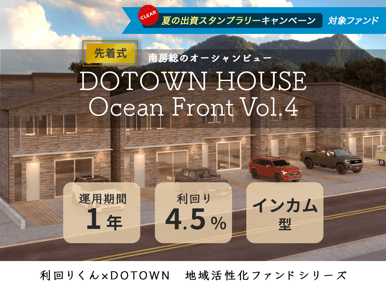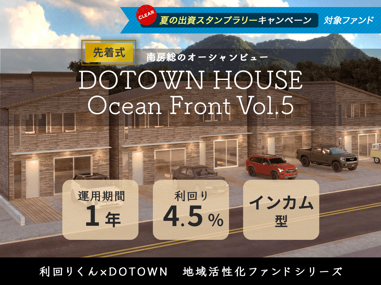 利回りくんにて、地域活性化を目指すDOTOWNと共に、地域活性化ファンドシリーズ「DOTOWN HOUSE Ocean Front Vol.4」「DOTOWN HOUSE Ocean Front Vol.5」のファンド募集を8月7日(月)より同日募集開始いたします。募集金額は3,893万円と3,528万円の合計7,421万円です。
