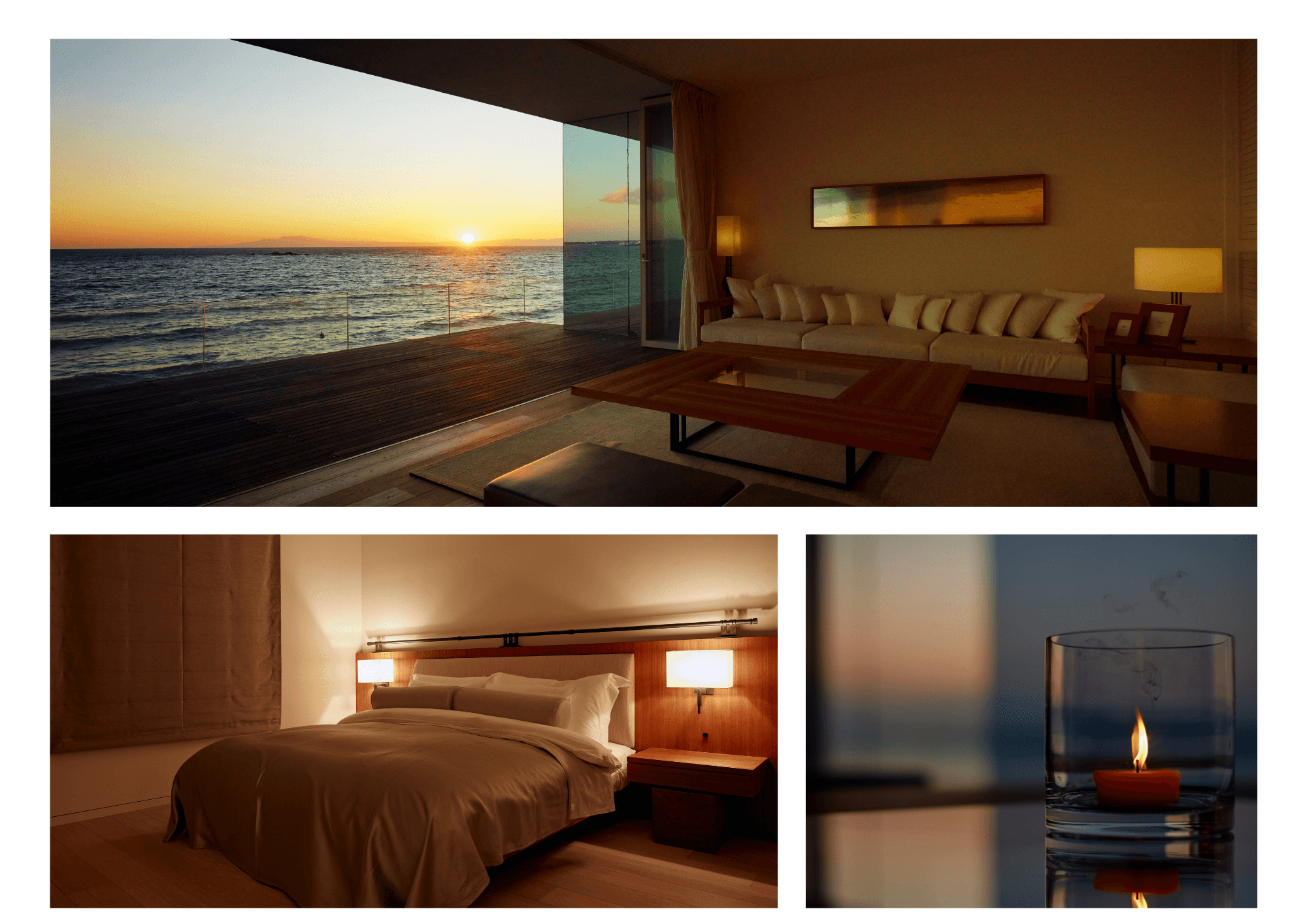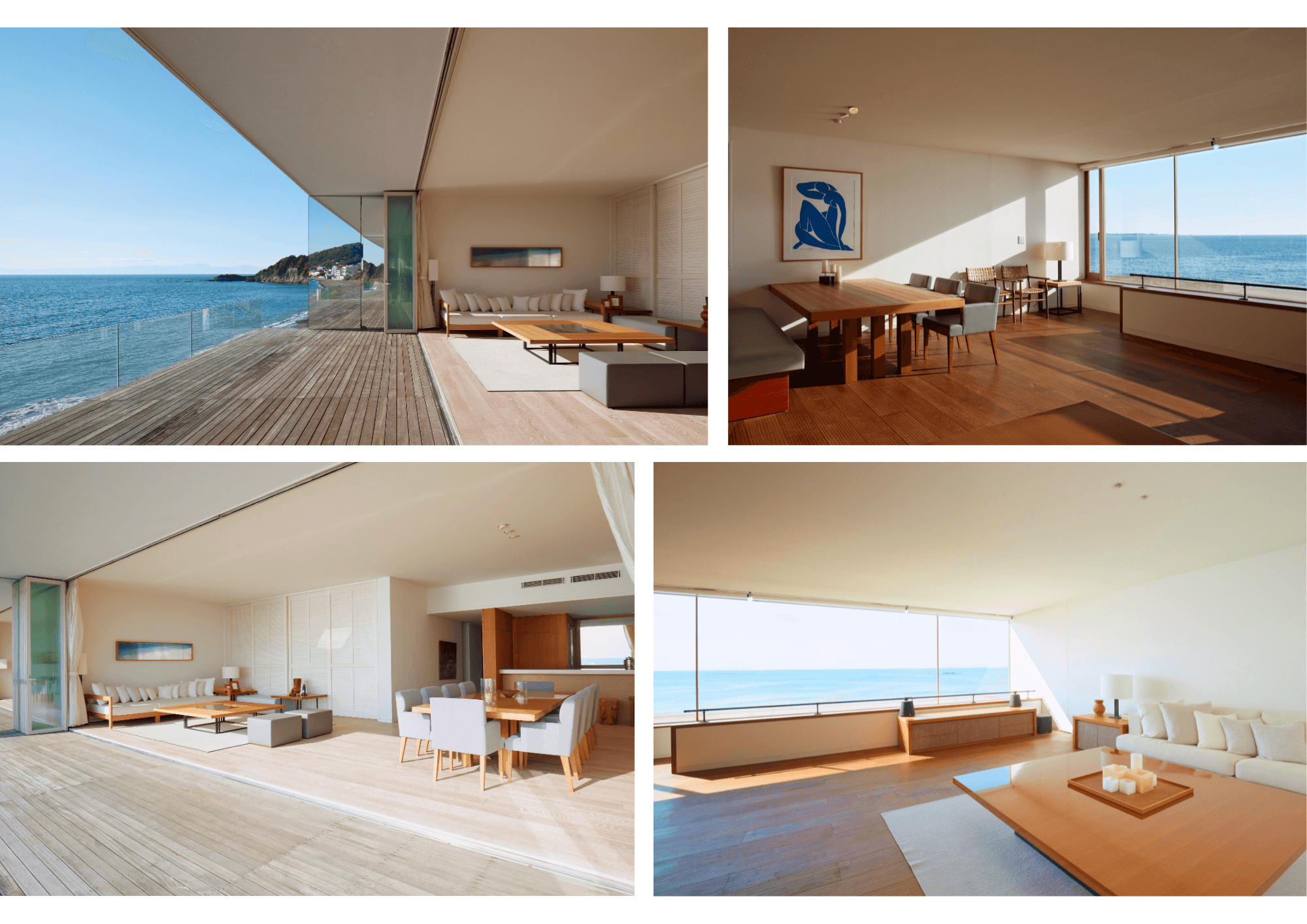 ・夕日が沈む相模湾を一望できるメイン客室とベッドルーム