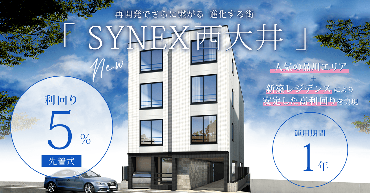 不動産クラファンの利回りくん、4大ターミナル駅直通の西大井で新築レジデンス「SYNEX西大井」を組成いたします!