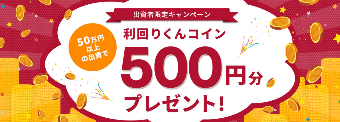 1ファンドにつき50万円以上の出資で利回りくんコイン500円分をプレゼント!