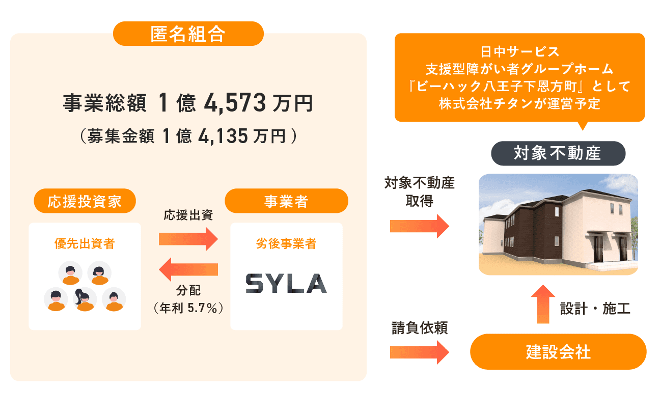 本ファンドは、株式会社アニスピホールディングス(以下「アニスピ」)がフランチャイズ展開する日中サービス支援型障がい者グループホーム「ビーハック」シリーズの新新規開発を目的としたファンドです。「ビーハック」は、障がい者の重度化・高齢化といった課題に対応する新たグループホームのブランドとして高い評価を受けています。本ファンドでは、匿名組合で土地を取得し、新築の「ビーハック八王子下恩方町」を建築します。