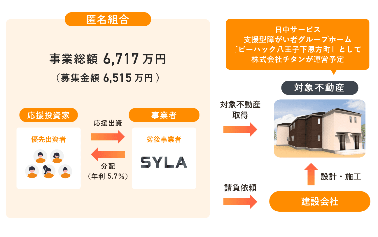 本ファンドは、株式会社アニスピホールディングス(以下「アニスピ」)がフランチャイズ展開する日中サービス支援型障がい者グループホーム「ビーハック」シリーズを新築で建設する開発型ファンドです。「ビーハック」は、障がい者の重度化・高齢化問題に対応する新しいタイプのグループホームとして位置づけられています。匿名組合方式により土地を取得し、「ビーハック八王子下恩方町」を建築します。