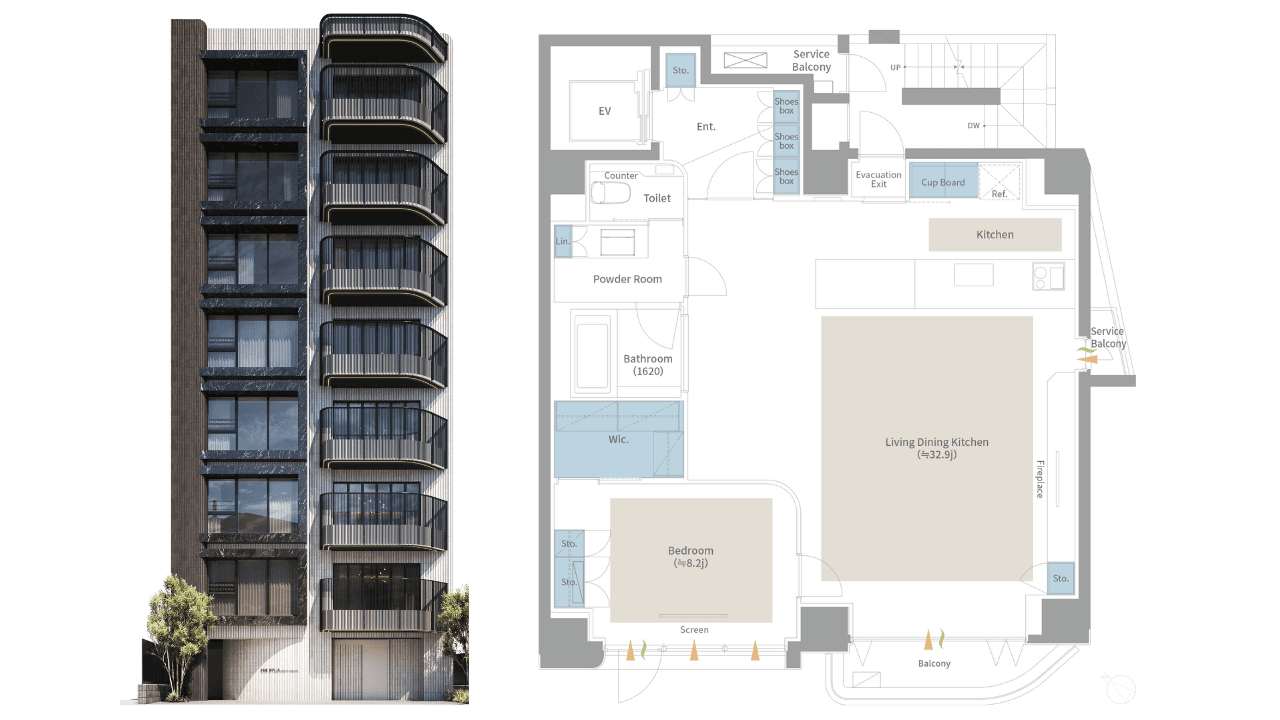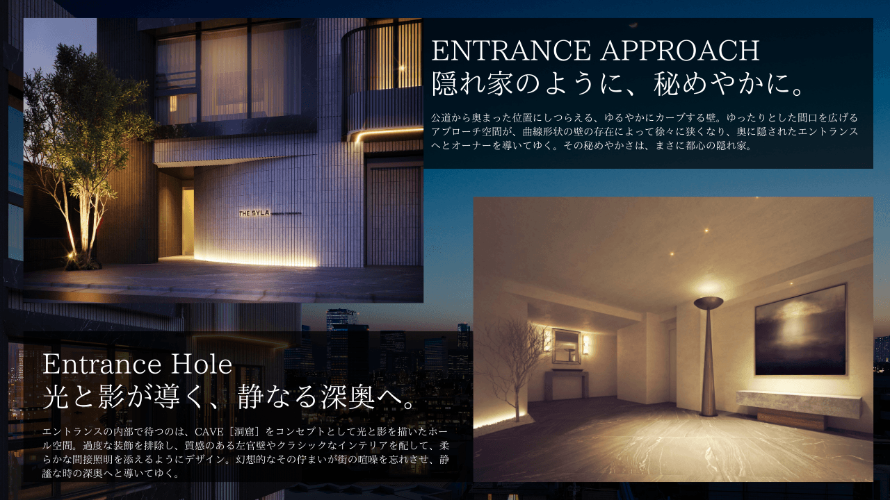 「THE SYLA SHIBUYA-TOMIGAYA」のデザインは、“Classic & Contemporary”をテーマに、時を超えて愛されるラグジュアリーを追求しています。直線と曲線の美しい融合がファサードに表れ、ルーバーやタイルの直線的なラインと、柱やバルコニーの有機的な曲線が優雅な調和を描いています。石調タイルで縁取られたダイナミックな開口部が、洗練された存在感を際立たせ、都市の景観に溶け込みながらもその独自の存在を主張します。物件の配置は、まるで隠れ家のような佇まいを意識しており、公道から奥まった曲線的な壁がゆるやかなアプローチ空間を形成し、住まう人々を静謐なエントランスへと導きます。エントランスホールは「CAVE(洞窟)」をコンセプトに設計され、質感のある左官壁やクラシックなインテリア、柔らかな間接照明が調和した幻想的な空間を演出しています。この空間は、喧騒から解放され、深い安らぎをもたらす場所として、住人に静寂と癒しを提供します。