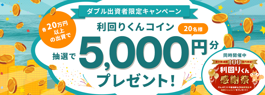 今回募集いたします2ファンドそれぞれに20万円以上のご出資で、利回りくん内で使える「利回りくんコイン」5,000円分を抽選で20名様にプレゼントいたします。