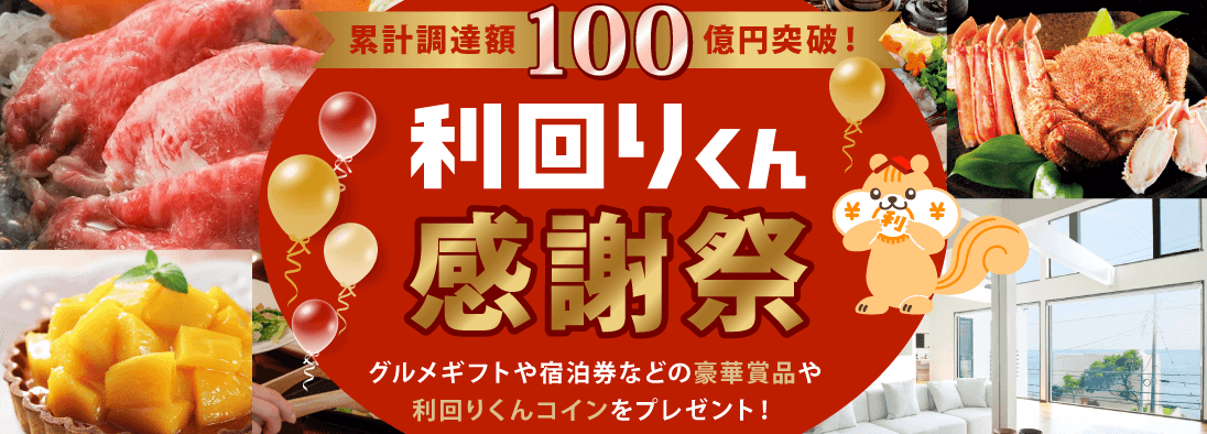 利回りくんでは累計調達額が100億円を突破したことを記念し、感謝の気持ちを込めて豪華プレゼントキャンペーンを開催中です。