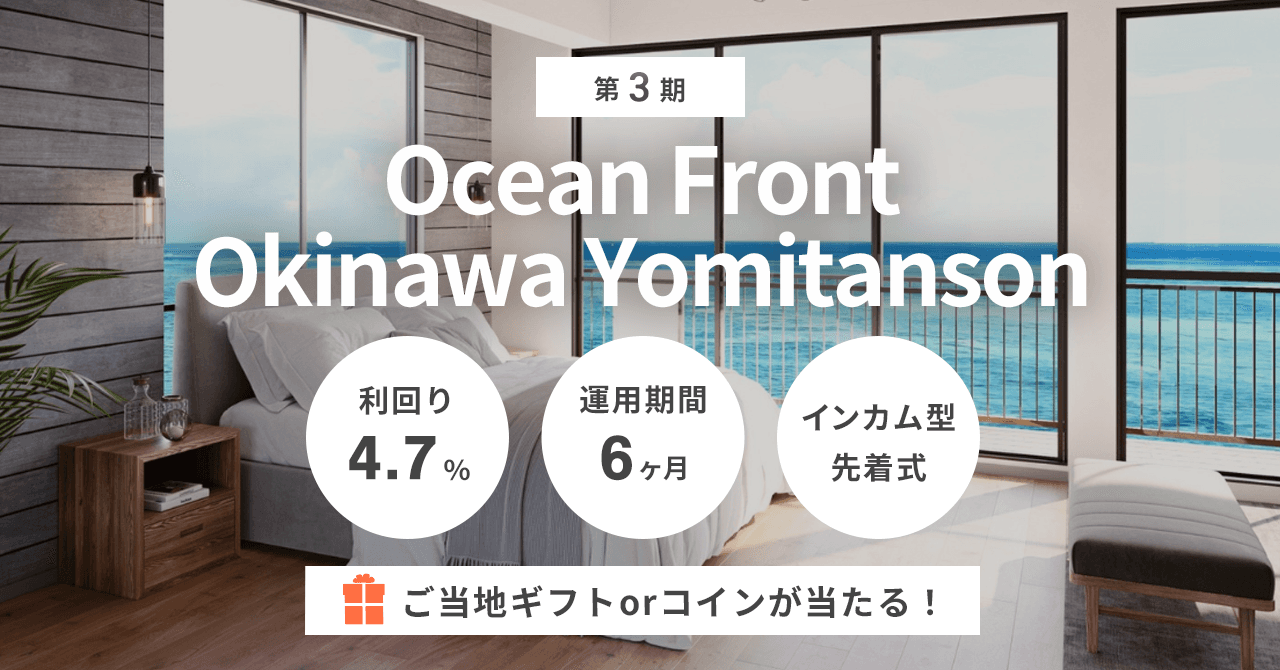 本ファンドは、4月末に予定通り運用終了となる「第2期 Ocean Front Okinawa Yomitanson」を再組成いたします。前回同様、利回り4.7%・運用期間6ヶ月と、短期間で効率的な運用をお考えの投資家様に最適なファンドです。