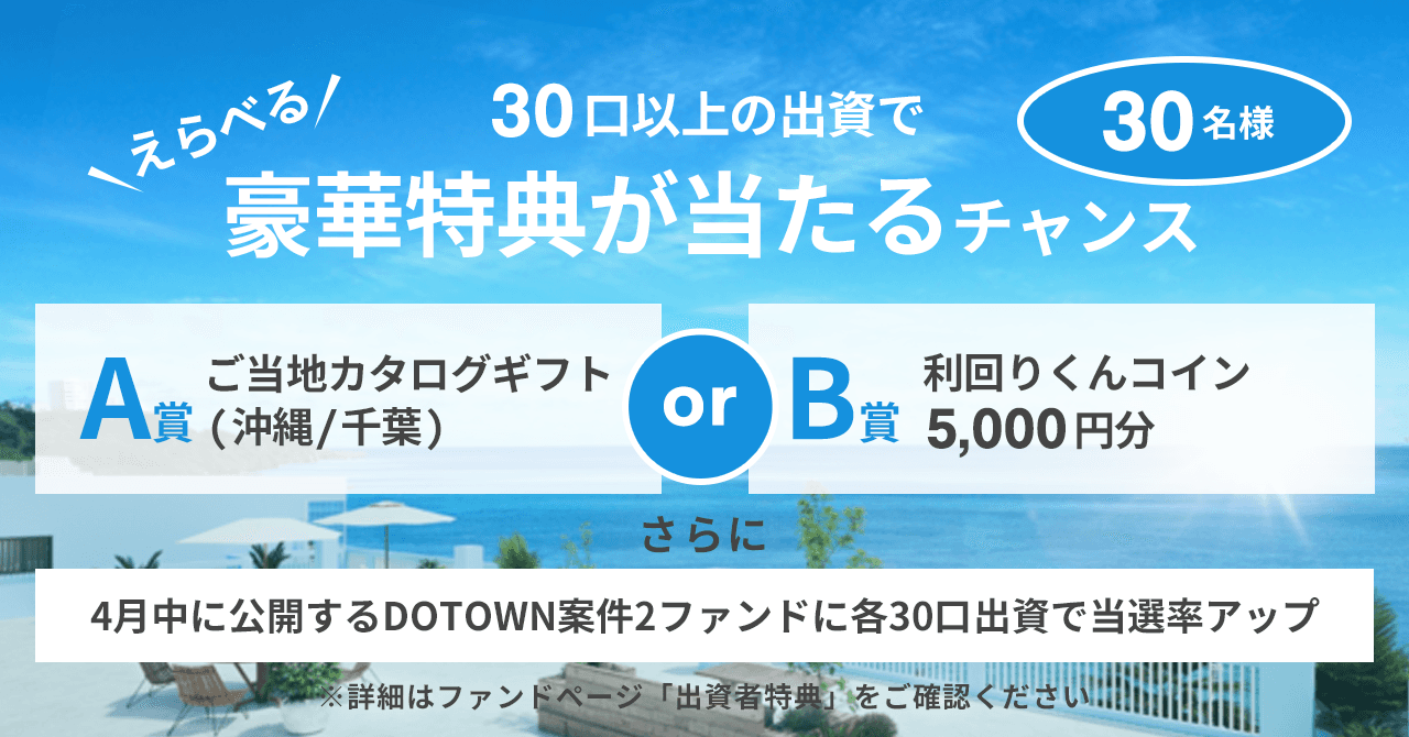 本ファンドに30口以上出資すると「第3期 Ocean Front Okinawa Yomitanson(ID:130)」のキャンペーンの当選確率がアップ! 詳細はファンドページをご確認ください。