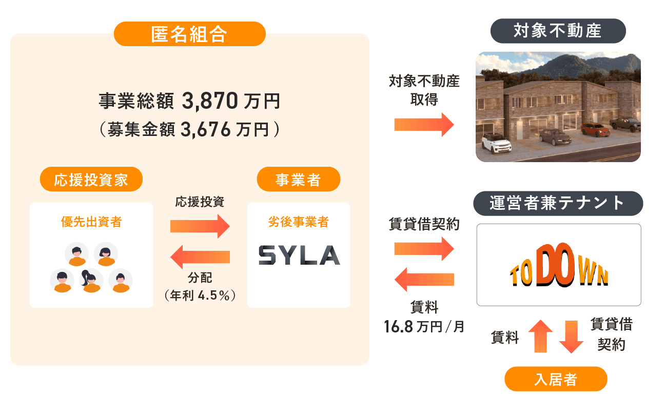また、本ファンドは、運用期間中に得られる家賃収益をもとに配当を行う「インカム型」のファンドであり、安定的な賃貸収入を通じてリターンを得られる仕組みとなっています。物件の収益性と地域特性の両面から、安心感と魅力を兼ね備えた投資機会を提供いたします。